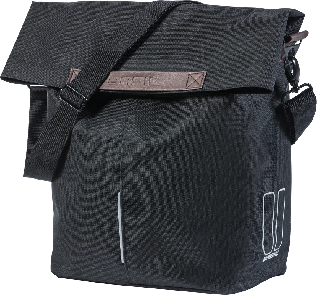 De Basil City Shopper is een waterafstotende fietstas met een afneembare schouderband. De tas werkt met het Hook-On systeem, waardoor de schouderband makkelijk los en vast te maken is. De vouwsluiting op het hoofdvak zorgt ervoor dat de regen van de tas afloopt, aan de binnenkant heeft de tas ritsvakken. De tas is rondom voorzien van reflecterende details voor een betere zichtbaarheid. De inhoud van de tas is 14-16 liter. Je kunt de tas eenvoudig bevestigen op de fietsendrager, en er ook weer gemakkelijk vanaf halen dankzij het vastzetsysteem.