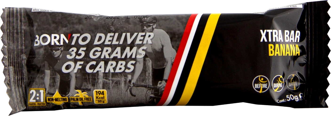 Xtra energie met deze energiereep van Born. De Xtra energierepen zorgen voor een langere aanvoer van energie ten opzichte van de normale Born repen. Deze langdurige afgifte komt voor uit een combinatie van verschillende type koolhydraten. Born Xtra Bar banana heeft een heerlijke vulling van rijstcrisps, havervlokken, stukjes aardbei en banaan, omhuld met een yoghurtcoating. De Orange smaak heeft daarentegen sinaasappelstukjes en pure chocoladesnippers. Per reep levert dit ongeveer 34-39 gram koolhydraten op. De Xtra Bar is gemakkelijk weg te happen, dus ook prima te gebruiken tijdens wedstrijden of in lastige omstandigheden.